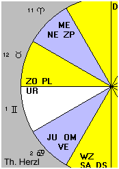 Theodor Herzl: Uranische stichter van een Saturnale staatTheodor Herzl is op 2 mei 1860 geboren in Boedapest, volgens de Duitse Astrodatabank rond 8 uur 's morgens.Die geboortetijd brengt een aantal dierenriemtekens naar voren die het tegendeel zijn van de tekens die het zogenaamd moderne Israel beheersen: Zon in Stier en Maan in Weegschaal, twee tekens die beheerst worden door de vredelievende planeet Venus, de ascendant in het journalistieke (oppervlakkige) teken Tweeling (kijk naar het pamflet 'De Jodenstaat' - een journalistiek werkstuk en als zodanig het tegendeel van het wijdlopig-langdradig-filosofische werk van Karl Marx) en tenslotte de excentrieke, moderne planeet Uranus in het eerste huis, een planeet die Herzl's grote liefde voor moderne techniek verklaart.