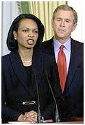 Ze zei dat president Bush nog niet heeft besloten hoe hij de Iraakse leider zal aanpakken. Maar hij vormt een te groot veiligheidsrisico om hem aan de macht te laten, aldus Rice. Gezien de dreiging die hij vormt voor de wereld zijn er 'zeer krachtige morele redenen' om een ander bewind te bewerkstelligen', aldus de veiligheidsadviseur. (Diederik van Hoogstraten, VK 16-8-2002)
