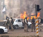 U.S. soldiers secure the scene of a car bomb which exploded outside the main gate to the headquarters of the U.S.-led coalition in Baghdad Sunday, Jan 18, 2004 . Reports say at least 18 were killed. (AP Photo/Muhammed Muheisen)